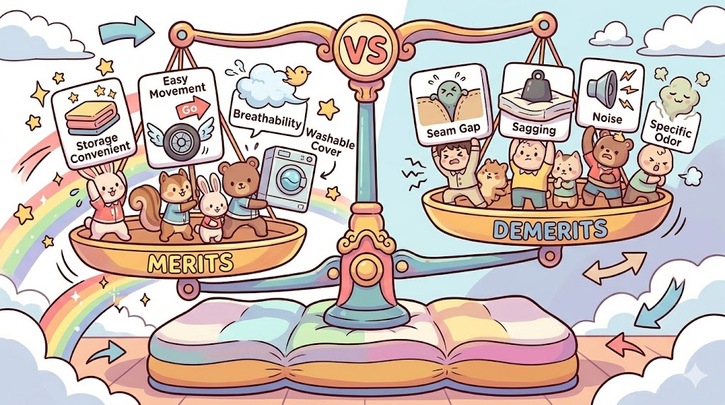 特に三つ折りタイプは継ぎ目がある分、薄い製品だとその部分から床の冷気や硬さが伝わりやすいというデメリットもあるようですね。